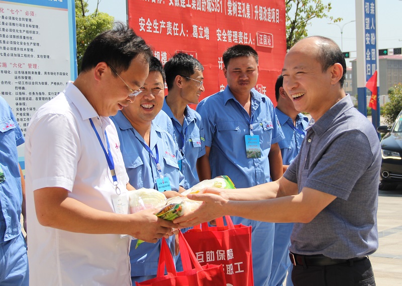 7月30日,集团公司董事长赵时运在工会主席徐晓光等领导的陪同下,冒着高温酷暑来到舒城S351(棠树至孔集段)改扩建项目,看望慰问了高温下奋战在施工一线的工程公司、路桥公司的工程建设者,并为他们送去了毛巾、绿豆、白糖、风油精、十滴水等防暑降温用品。