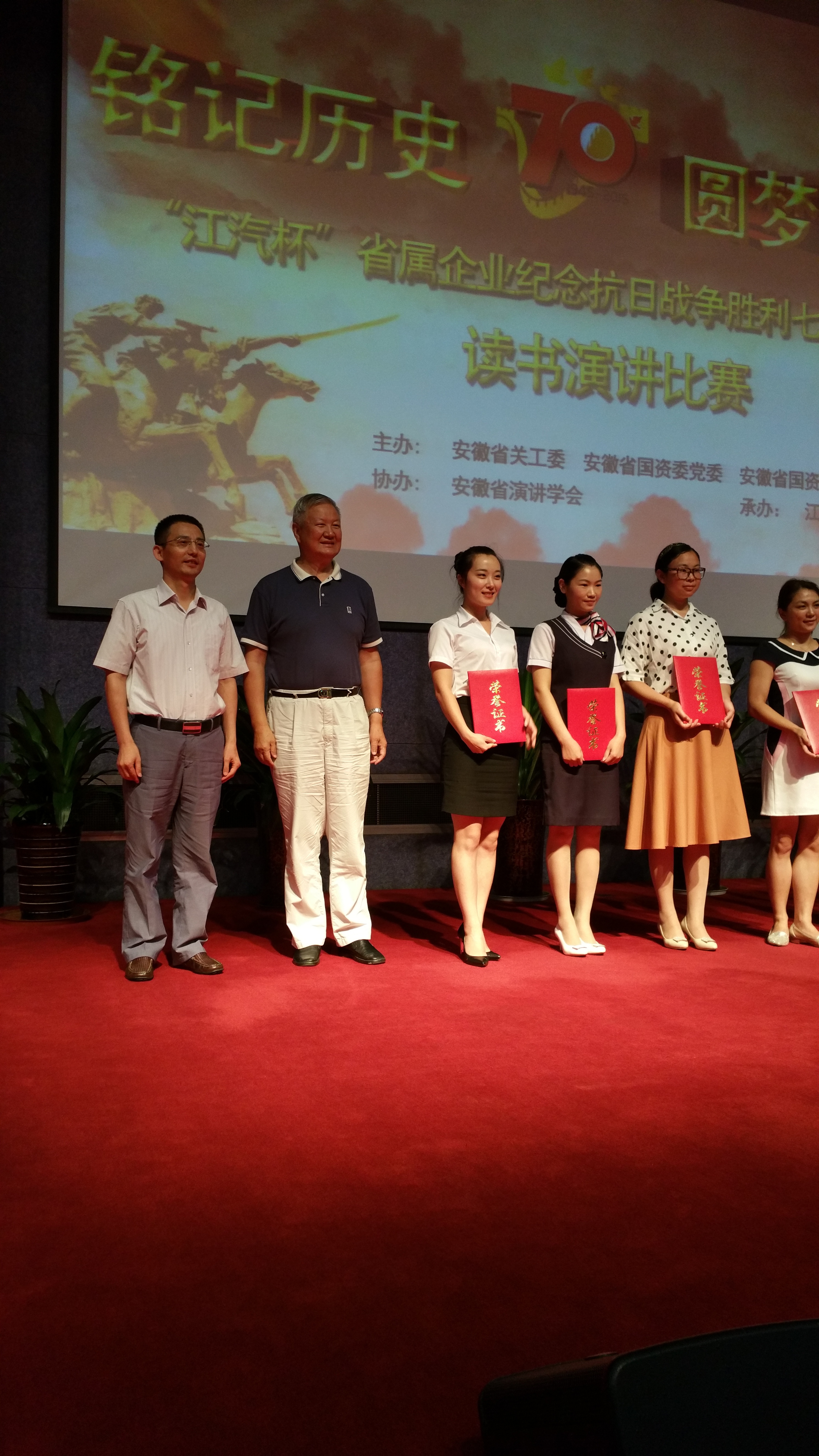 8月21日,由安徽省关工委、安徽省国资委党委联合主办的“铭记历史 圆梦中华”省属企业纪念抗日战争胜利七十周年念书演讲角逐在安徽江汽集团落下帷幕。本次角逐赛期一天,共有24个省属企业的30名选手加入角逐。MG电子推荐的选手杨夕以9.72分的结果位列全场第八名,荣获三等奖。