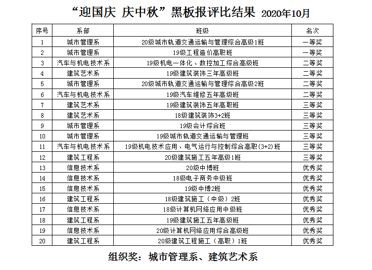 此次黑板报评比运动自9月下旬开始以来,经过五系、直属部的层层筛选,最终推选出26个班级进入学院参评。各班级围绕主题精心策划,结合系部专业特点,设计出了主题鲜明、版面整洁、内容新颖、图文并茂的作品,整体水平较往届有很大的提高。评委组严格依据评分标准,进行仔细的检查,认真的评判,评选出一等奖2个,二等奖4个,三等奖6个,优秀奖8个,组织奖2个,获奖情况如下: