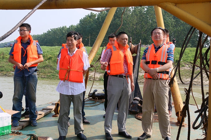 在交通艇上,刘总认真听取了安徽交航青弋江疏浚项目的详细介绍,了解了施工进度和下一步施工计划。登船后与海员们一一握手、亲切交谈,询问他们生活饮食情况、防暑降温步伐,随后登上船舶操作室,详细了解挖泥船施工技术,通过GPS定位视察位于水下的施事情业面积。刘总嘱咐海员们在船上作业要注意宁静,在酷暑天气包管生产进度的同时切实做好防暑降温事情,确保健康防暑、平安防暑。