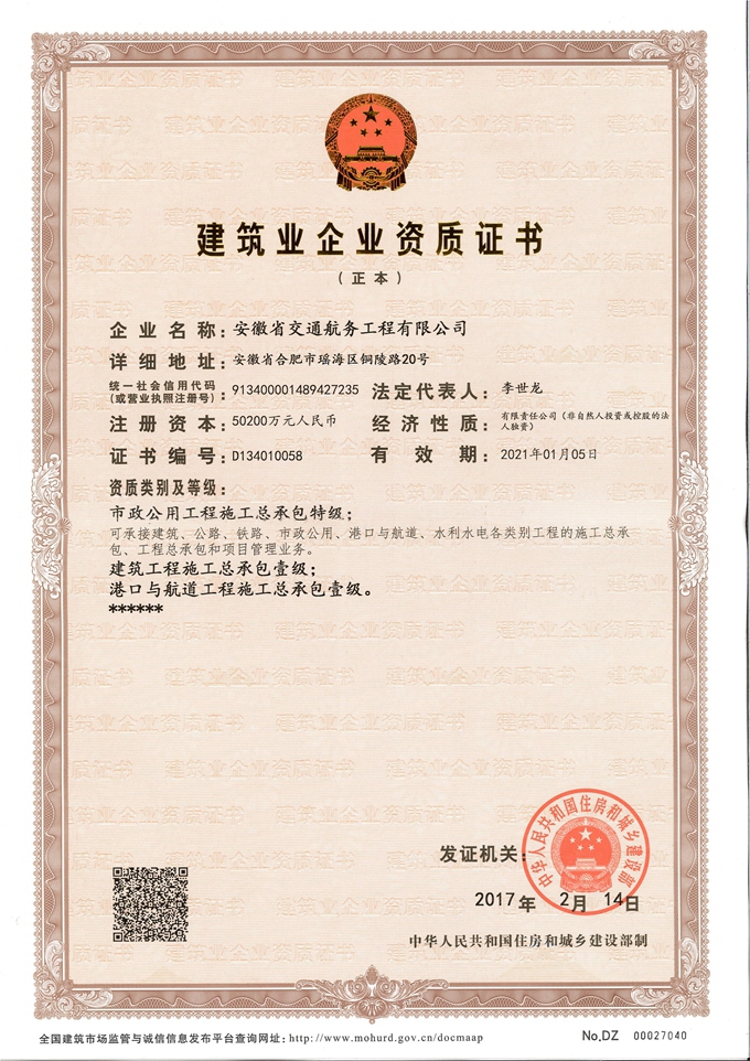 安徽交航公司喜获市政公用工程施工总承包特级资质