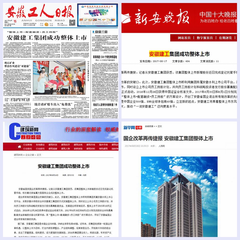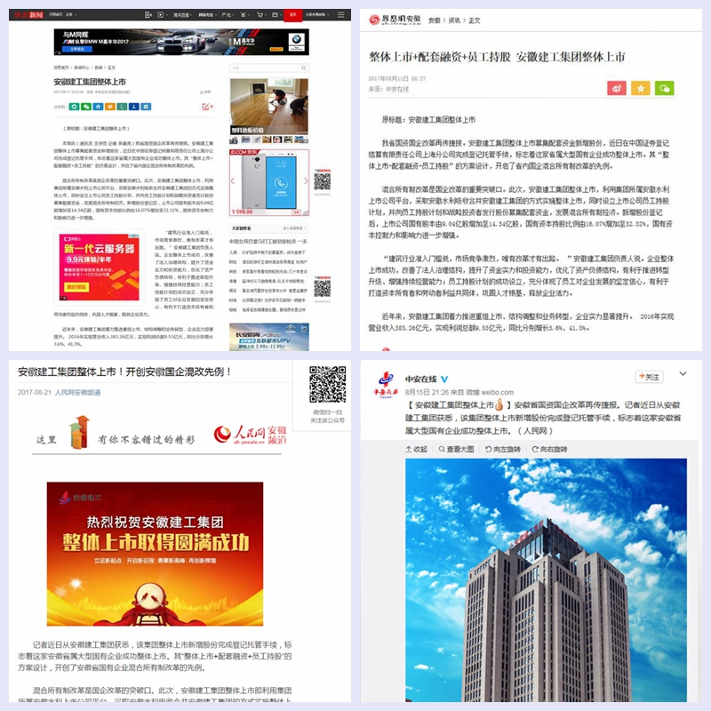 截至目前,建筑时报、安徽工人日报、新安晚报、安徽建筑业等报刊,中何在线、新华网安徽、央广网安徽、中新网安徽、凤凰安徽、新浪安徽、网易安徽、徽商网、今日头条、一点资讯等网站,中何在线客户端、人民网安徽客户端等新媒体,以及财经证券类新闻媒体,纷纷聚焦安徽MG电子整体上市,刊发或转载稿件40余篇,对集团公司深化革新、转型升级、立异驱动取得的显著结果进行充分报道,宣传的规模、广度和深度均创集团重大运动对外宣传之最,极大提升了安徽MG电子的社会知名度和企业影响力。