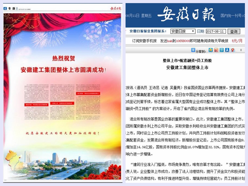 《安徽日报》以“整体上市+配套融资+员工持股,MG电子整体上市”为题宣布要闻消息,称集团整体上市一揽子计划设计,开创了我省国企混淆所有制革新的新规范。并推出整版专题报道《热烈祝贺MG电子整体上市圆满乐成》,从“转型升级,古板国企走出生长新路”、“改制上市,生长混淆所有制经济”、“借力借智,推动企业做强做优做大”等方面,全面论述集团整体上市的辉煌历程和重大意义。
