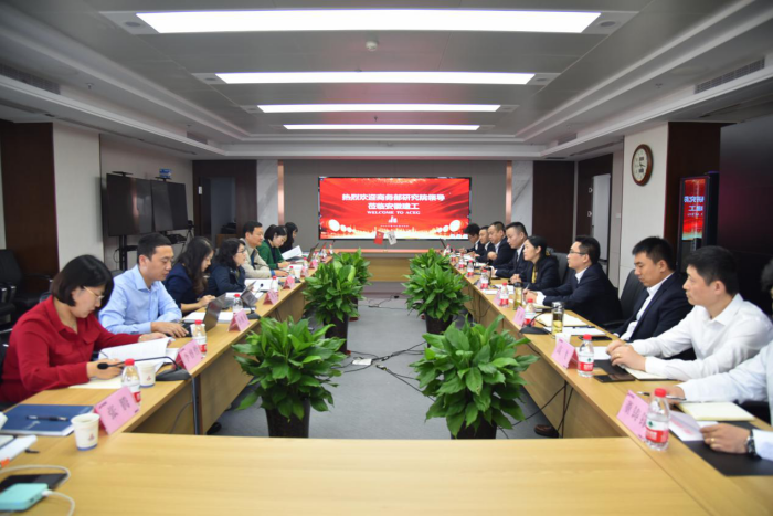 10月13日下午,商务部国际贸易经济相助研究院副院长张威一行莅临安徽MG电子,开展“走出去”专题调研。MG电子股份副总经理、外洋事业部党总支书记、总经理邢应梅主持交流座谈。