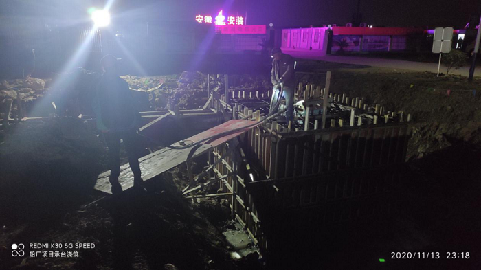 蚌埠市临港智能制造工业园项目总建筑面积4.46万平方米,工程总造价8500万元,是蚌埠市“退市进园”搬家重点建设项目。初冬以至,天气渐寒,项目上却是一片大干的火热景象,放线丈量、钢筋焊接、承台浇筑……所有施工机械满负荷运转,所有项目人员均在生产一线争分夺秒。凭据原施工计划,临港项目189个承台的钢筋捆扎焊接及三千余立方的混凝土浇筑应在11月底完成,但晴雨表显示11月下旬均为阴雨天,所以必须提前完成此项施工任务。时间紧、任务重,项目部立刻行动起来,实时调解施工及进度计划,加大人力、物力的投入,全体员工主动放弃休息,不分昼夜、“5+2”“白+黑”,轮流坚守在施工现场。临港的夜幕已经徐徐降临,但项目上仍然人头攒动、身影忙碌,施工人员在黑夜的画纸上勾勒出了一副“大干快上,只争朝夕”的场景。