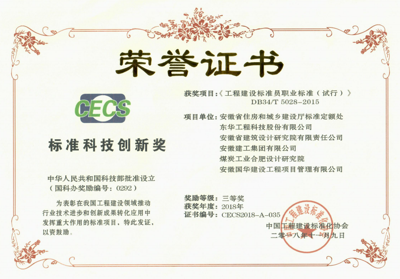 According to the official announcement of China Engineering Construction Standardization Association about the Standard of Science and Technology Innovation Award selection results (Building standard association letter coded 2018 # 53) released days ago, the “Professional Standards for Standardization Supervisors (Trial) (DB34 / T 5028-2015)” edited by ACEG won a third award of Standard Scientific and Technological Innovation.